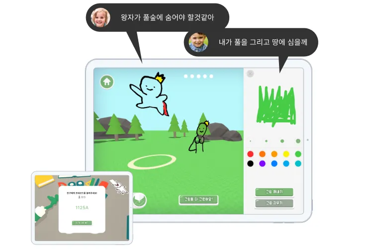 Function 03 아이는 다른 아이들과 같이 동화책에 필요한 낙서가 무엇이 있을지, 어떤 역할을 맡을지, 동화를 만들기 위한 계획을 같이 생각해나가면서 사회성 및 협동성과 타인을 생각하는 사고력을 기를 수 있다. 초대 코드를 이용한 멀티 기능을 통해 아이들은 한 공간에서 그린 낙서를 서로 공유하고 동화에 필요한 그림을 같이 제작할 수 있다.