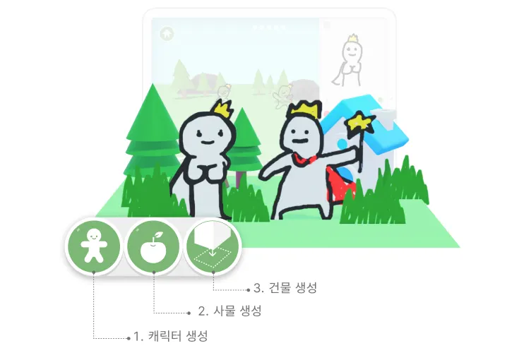 Function 02 3D 환경에 2D 낙서를 매개체를 하는 확장성 높은 2.5D 메타버스 환경을 이용하여 아이의 메타버스의 참여도 및 활용도를 높였다. 아이는 동화에 필요한 환경이나 소품을 직접 그려 이곳 저곳에 배치하고 캐릭터를 그리고, 건물을 배치하여 손쉽게 동화환경을 조성할 수 있다.